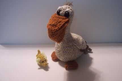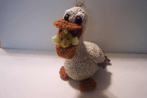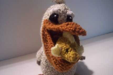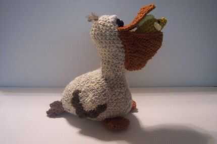 Diseñé con chico sin un patrón. Hizo de LionBrand facilidad de lana e hilados de Jiffy, y la fishie está hecha de algunos viejos hilos vintage de mi escondite. Las pulgadas de is11 pelícano altas y su compinche de peces es de 3 pulgadas de largo.