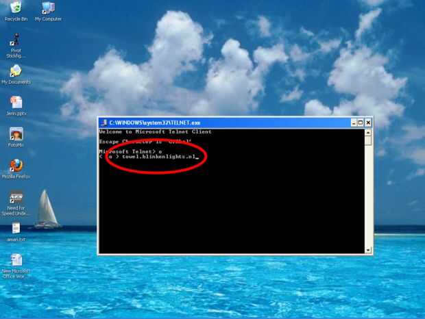 Se abrirá el cuadro de diálogo de Telnet. 1.) escriba "o" sin las comillas 2.) escriba towels.blinkenlights.nl 3.) pulse enter (Al hacerlo tu internet debe conectarse). Espere un tiempo ahí finalmente /..,,,