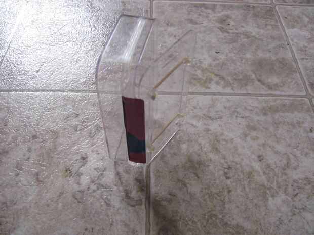 Tomar el soporte y coloque el lado de Ipod hacia abajo en la parte superior de la caja. Hacerlo centrado y entonces hacemos una cinta hing. Aquí utilicé cinta de embalaje transparente pero ou podría utilizar casi cualquier cinta (conducto de cinta, cinta gorila, cinta aislante, etc...). Coloque la cinta en el borde de manera que puede voltear el monte arriba y abajo. Ahora tenemos que hacer un tapón para que el montaje se detiene en 90 grados a la caja. tomar la tarjeta de plástico y cortar una formas de longitud de stip sobre una anchura de centímetro y medio. corte outthe tira y pegar a tlid de la caja con un poco de pegarse para arriba para que el Monte golpear. Esto actuará ahora como un trípode para ti Ipod.