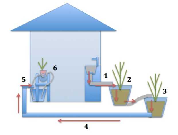 1) agua es recuperado de un origen interior, como un fregadero y fuera a la primera planta grande. 2) la planta grande es apoyada por el sustrato, como grava, que actúa como un filtro para el agua. El agua fluye a través del filtro, alimentación de la planta como va. 3) el proceso se repite en la otra planta grande. Podría ser una planta grande o como desee. 4) los flujos de agua hacia la casa, depende de la gravedad o que requieran una bomba por lo puede 5) volver a entrar en la casa y el pequeño sistema hidropónico. 6) los ciclos de filtrado de aguas grises a través del sistema hidropónico pequeño. Para evitar abrumar el depósito interior, la sección interior y exterior sección de vez en cuando debe ser desconectado.