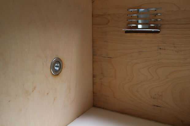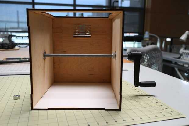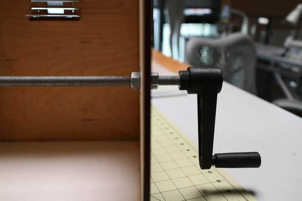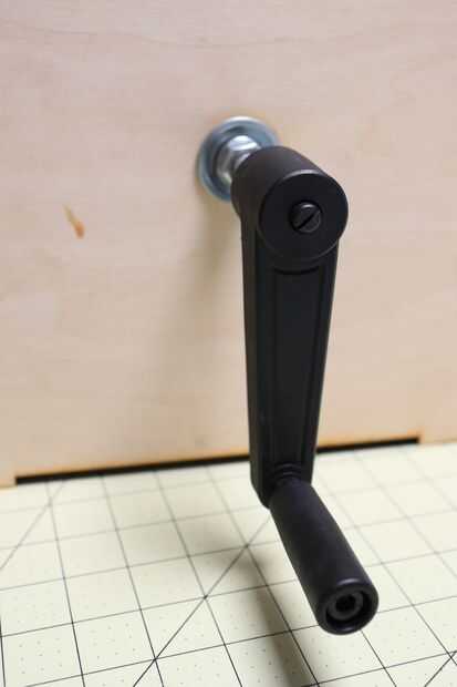 Con los cojinetes en su lugar, pude ejecutar la varilla roscada con la manivela unida a través de la caja así como el huso. He incluido una foto del donde el hardware tiene que ir, sin el eje, por lo que es más fácil comprender cómo las tuercas agarre los rodamientos.