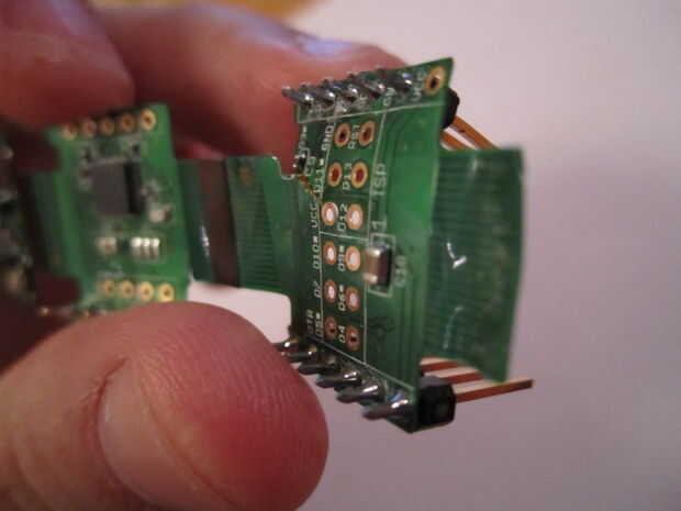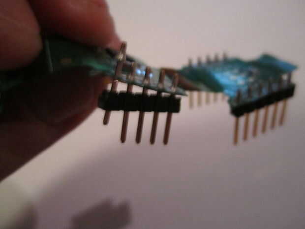 Queremos al puerto de programación en el primer cuadro de la soldadura. Las salidas de pin son el orden de izquierda a derecha: DTR, RX, TX, GND y VCC. Primero usé cabeceras breakaway hombres. Estos son generalmente grandes de prototipos, especialmente con un protoboard. El problema que encontré fue que si no tiene cuidado al retirar la película Seeeduino de la protoboard, usted puede fácilmente rasgar la película. Que es exactamente lo que hice.