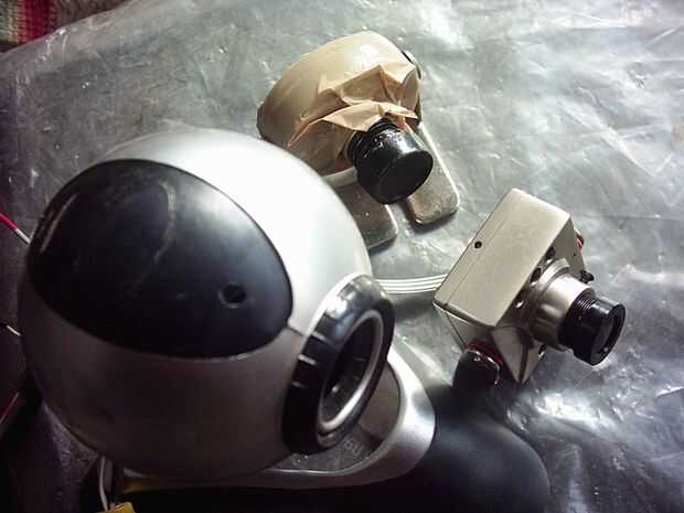 Esa cosa redonda grande es una Webcam USB, y los otros dos son cámaras de vídeo CMOS. He utilizado hasta 25 metros de cable de cinta de cuatro conductores (masa, + 12V, video y repuestos) entre cámara y captura de la tarjeta sin efectos dañinos.