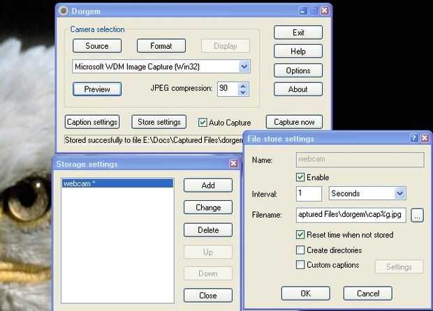 La captura de pantalla muestra Dorgem está configurado para almacenar archivos con la etiqueta de nombre de archivo seguro segundos - '%g'. Esto resultará en un nombre de archivo único para un momento determinado del día.