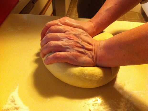 Doblar suavemente la masa en sí mismo, aplanar y doblar otra vez hasta que la masa esté lo suficientemente firme como para amasar.