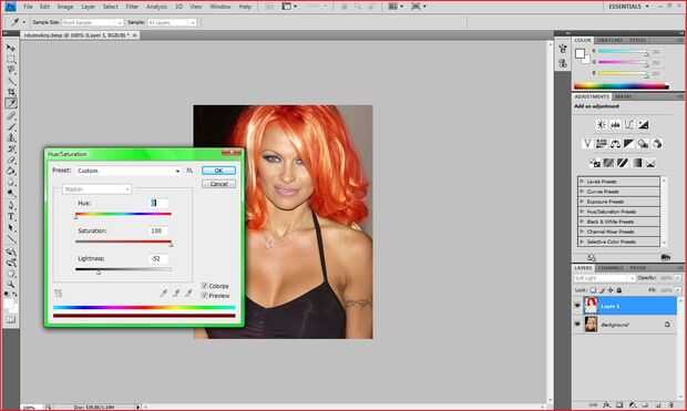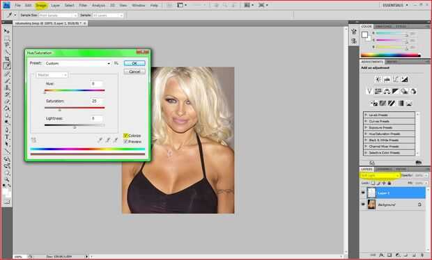 una vez la imagen en luz suave puede ir a la imagen en la barra de menú > Ajustes > tono y saturación. una vez que el pop up se abre pulsas colorear y elegir cualquier color que quiera pero puede que tenga que mover toda la barra para conseguir ese color perfecto.