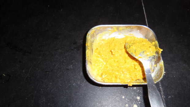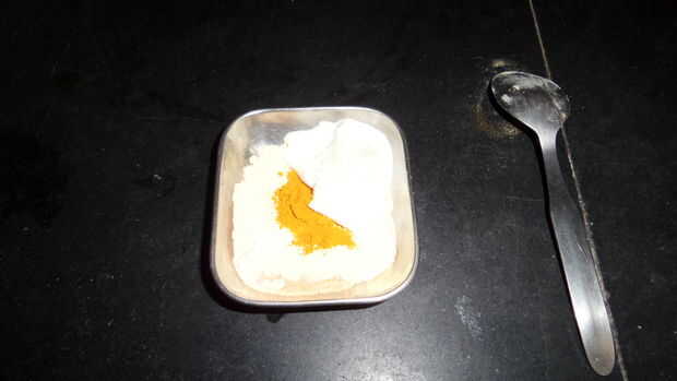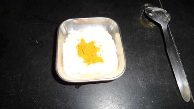 Gramo de suelo en un tazón pequeño y agregue 1 cucharada de cúrcuma y añadir cuajada colgado para hacer una mezcla espesa.