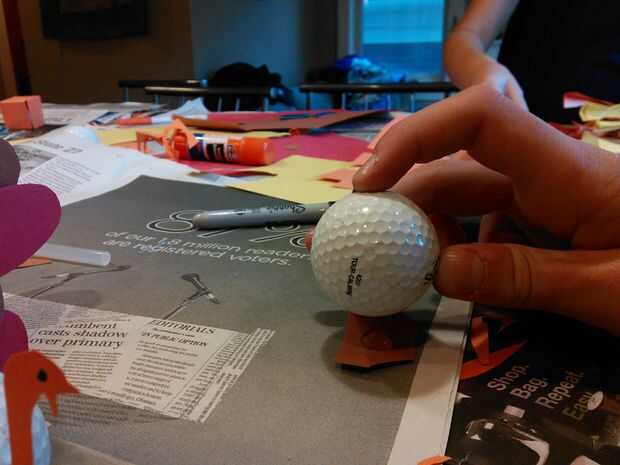 Poner un poco de pegamento caliente en los pies y la pelota de golf se aplican antes de que el pegamento se seca.