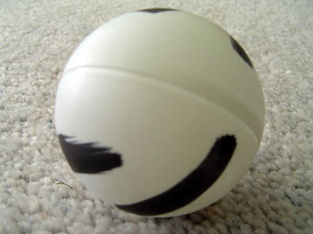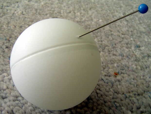 Hágale un agujero en la bola con el pin en como bajo un ángulo como sea posible y añadir marcas al azar con el lápiz (para que la rotación es visible). Recoger la pelota de ping-pong con pinzas y sumergir en nitrógeno líquido durante unos 10 segundos. Eliminar y liberar. Tirar en el piso funciona bien - susurro y girar y mover horizontalmente en una dirección al azar. En el video, limita con un cable de extensión por lo que permanecía en la gama de cámaras cerca, pero es mejor si no lo hace - mucho más divertido que ir zumbando de un lugar.