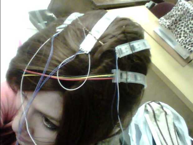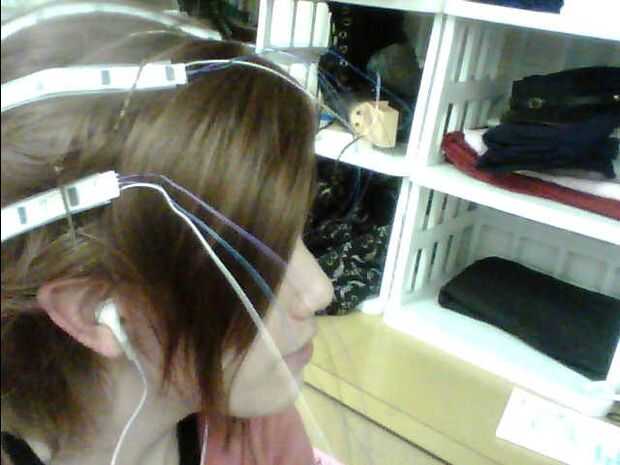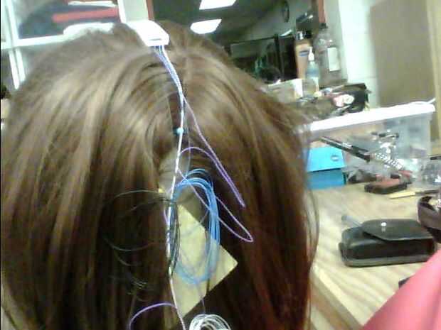 Sugiero poner la peluca y luego bobby-fijando los puntos de anclaje para sus LEDs de que forma puede ser feliz con donde se colocan a usted en lugar de la cabeza del bloque te están utilizando.  Porque tú y el bloque de cabeza parecen diferentes.  PIN y cruzar los pasadores en forma de 'X' para que sostenga firmemente sus luces.  Causa que va a ser empujones esta peluca alrededor como usted alambre.  Como una nota de advertencia, no prender la luz sí mismo o el chip.  Usted puede romper su unidad haciendo eso.