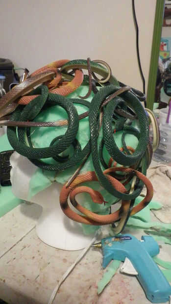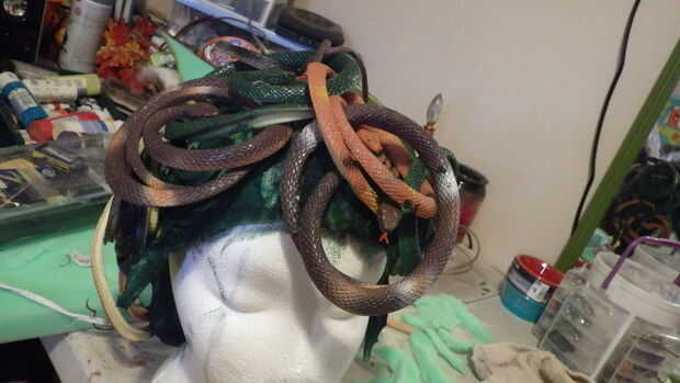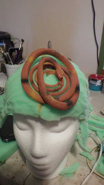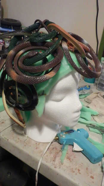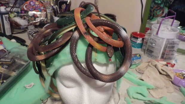I cortar pequeños agujeros y había pegado al final de las colas en la espuma pero no es totalmente necesario porque el espacio se llena. Yo en espiral las serpientes grandes y utiliza un montón de pegamento caliente para ocupar espacio y dar la ilusión de rizos. Quería añadir a torcer, dar vuelta y textura a la peluca para darle movimiento y dar el ojo mucho para mirar. Una vez había cubierto la mayor parte de la zona de serpientes enroscadas tomé las serpientes adicionales y alimentado y teje a través de los que ya estaban pegados añade más pegamento cuando fui. No tenga miedo de pegar realmente encendido, él tiene un montón de pegamento! Una vez que tuve todas las serpientes enroscadas en su lugar fui y había pintado la espuma de un verde más oscuro. Para pintar la espuma sumergió mi cepillo en pintura entonces en más de una mezcla de agua de la espuma absorber agua. Cuando la pintura hace que el interior los bordes que se pueden ver así. La pintura tendrá que secar y porque es sobre todo agua con una esponja tarda algún tiempo. Me senté mi forma frente a un ventilador hasta que se seca a la prensa de un dedo.
