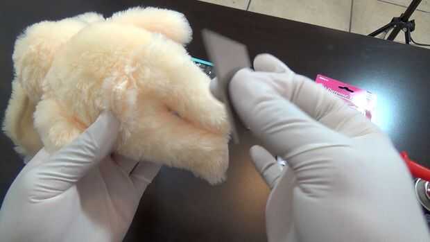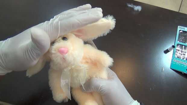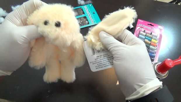 · Con una cuchilla de corte el conejo en la parte inferior derecha a lo largo de la costura, tomar todas de algodón de que hasta se parece a esto. Ahora es el momento mutilar ese conejito pobre desprendiendo una de sus orejas. También hacer un agujero en el lado de su cabeza justo donde el oído solía ser.