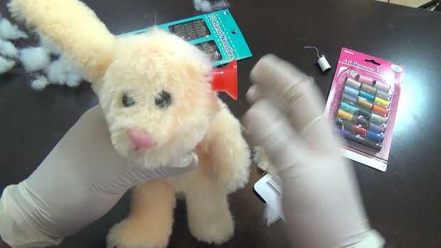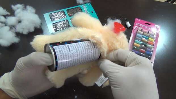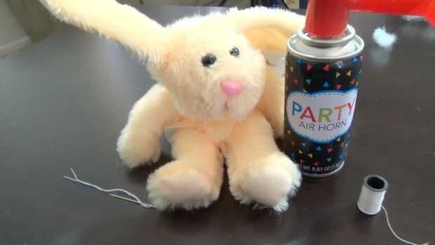 · Empuje el cuerno del aire puede dentro de cuerpo del conejo, todo el camino hasta sólo asegúrese de que la boquilla sobresale a través del agujero que usted hizo. Si la cara del conejo se ve demasiado plana llenarla con algunos de eso algodón extra que llevó a cabo. Utilizando hilo y aguja cosen la oreja en para ocultar el cuerno del aire no olvides coser por la parte inferior también.
