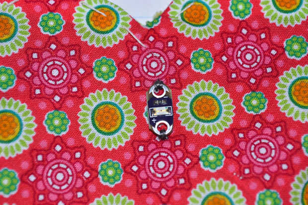 Una parte difícil es tomar la tierra (negativo) de la LilyTiny al LED. Sujeta el agujero negativo en el LilyTiny con hilo conductor y luego me descendió bajo la tela y el hilo de rosca emerge cerca del número 2 en la LilyTiny, sin tocarlo. Luego cosí hasta el agujero negativo en el LED.
