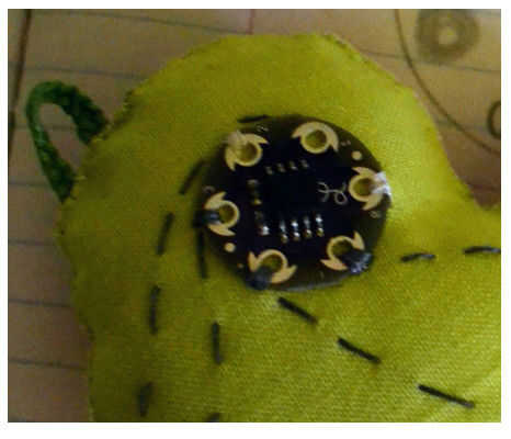 El LilyTiny del perno y garantizar por los pines gratis (0 y 2) de coser a la tela con hilo no conductor normal para facilitar la costura con el hilo conductor más adelante.
