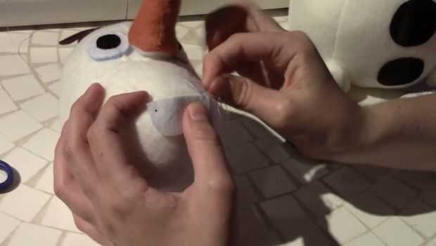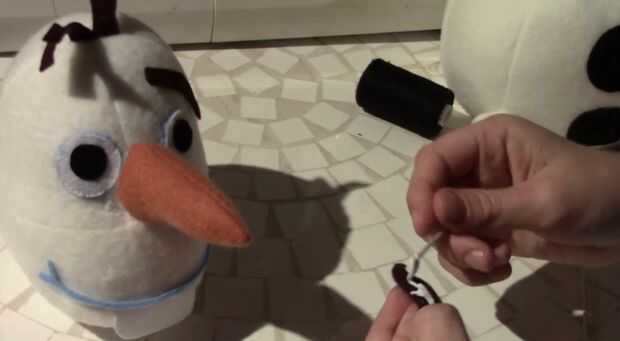 Coser los ojos en la cara y luego coser diente grande de la Olaf sobre su cara.