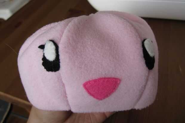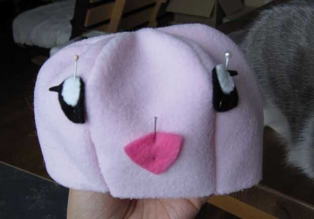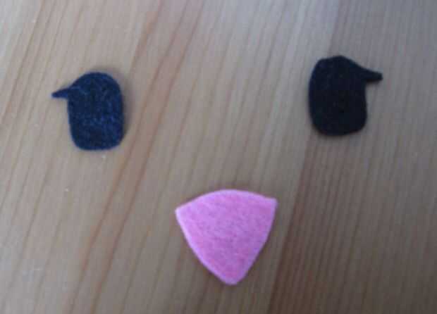 Cortar un montón de puntos en el fieltro de color rosa oscuro. Hacer de diferentes tamaños y formas (redondos y ovalados, grandes y pequeños). Mano coser algunos encima de la cabeza.
