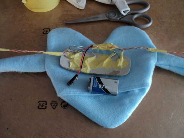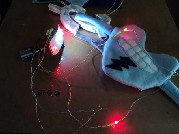 Iba a utilizar algunos rastros de alambre expuesto como Limpie contacto conmutadores en los extremos de las garras que actúan como interruptores para las luces. Usted podría conseguir lujo y hacen cosido hilo conductor cojines, cojines de tela conductora, longitudes de soldadura mecha, hardware del metal como las arandelas e incluso cojines de papel de estaño.