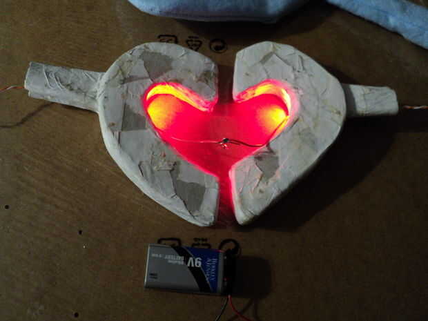 La boca sería un conjunto de LEDs blancos y un conjunto de LEDs de color rojo. Asomó sólo agujeros en una pieza de cartón laminado para los LEDs en lugar y cableado detrás de él. Usted puede protoboard si lo tienes disponible.