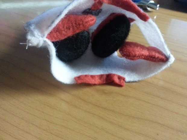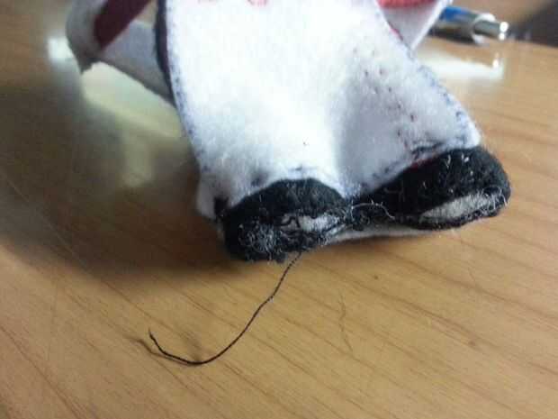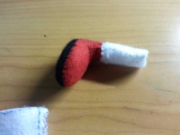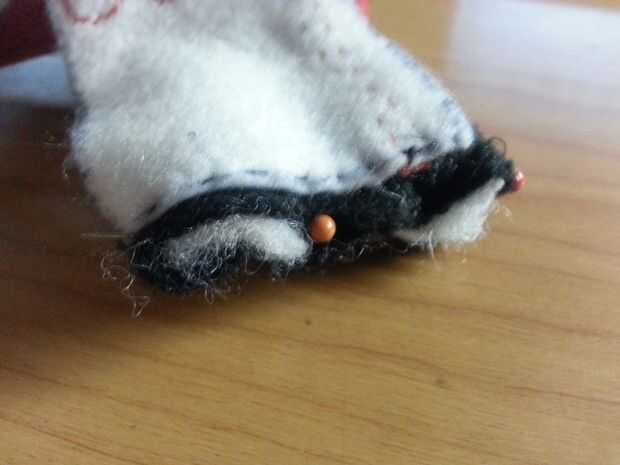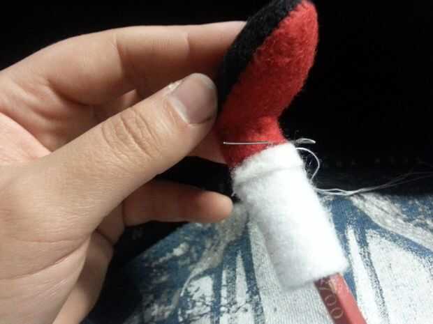 Utilice una puntada oculta para coser el zapato rojo en la pierna blanca. Mantuve un lápiz cuña para ayudarme a coser uniformemente.