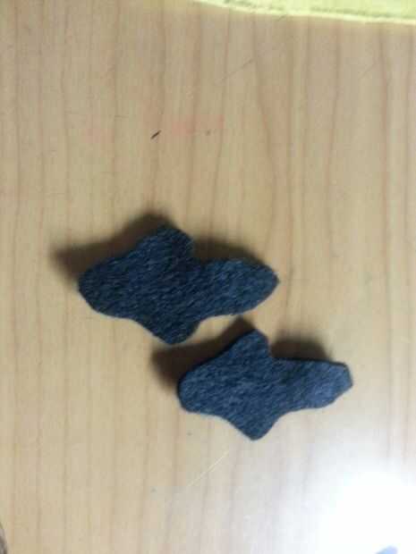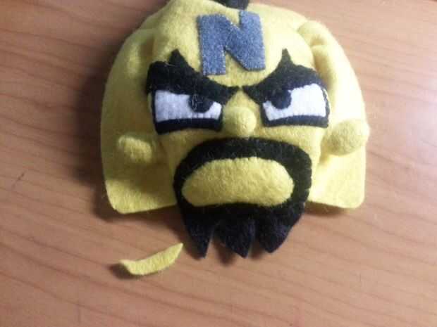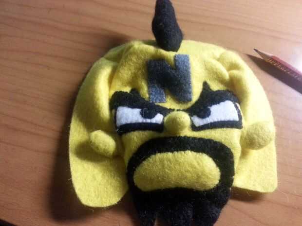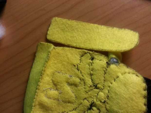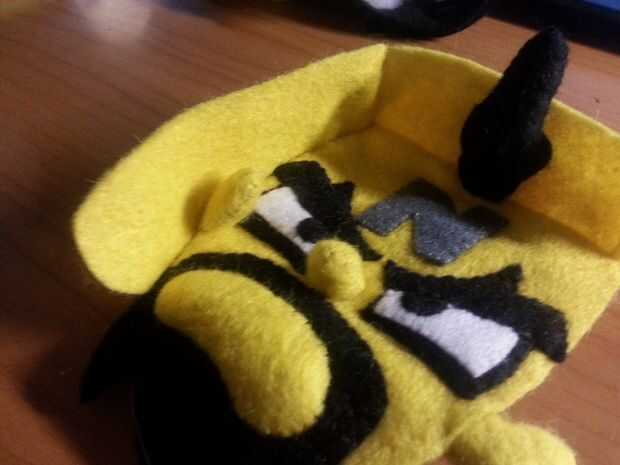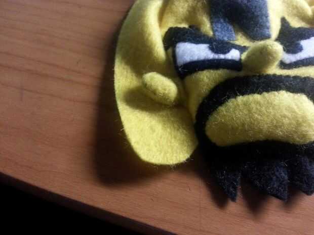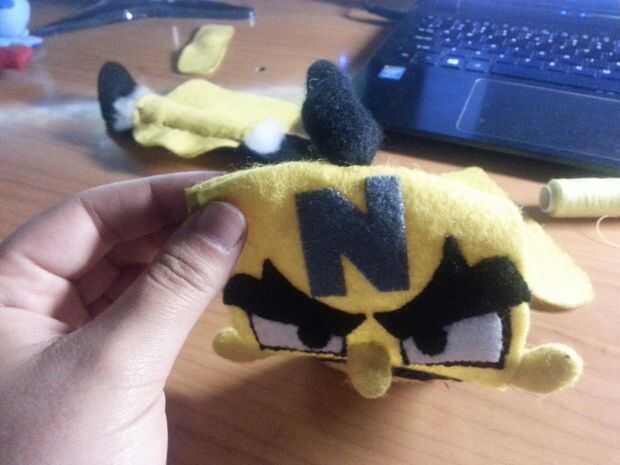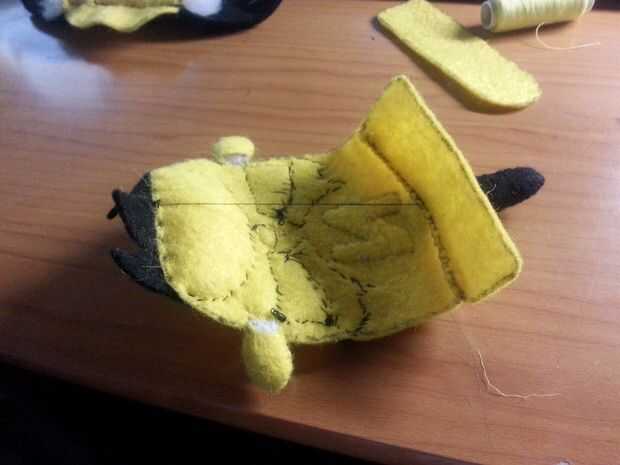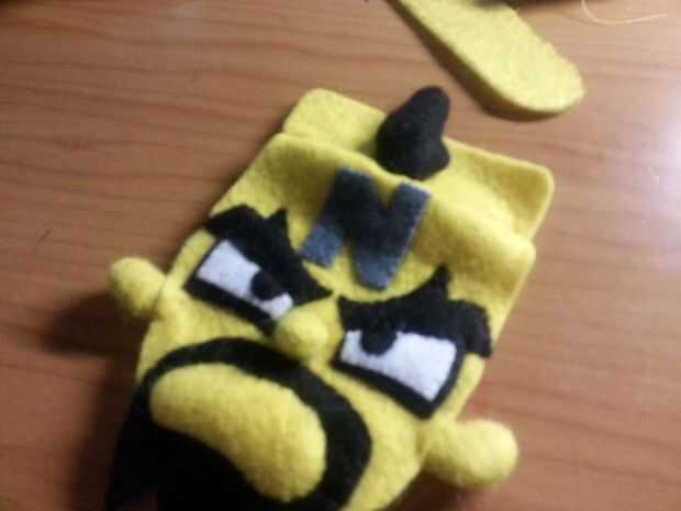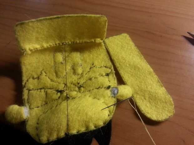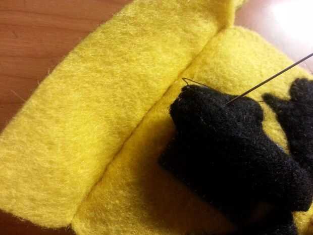 Coge los dos rectángulos largos amarillos junto a coser a los lados de la cabeza de Neo.