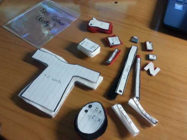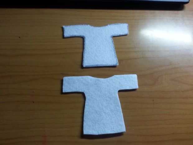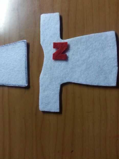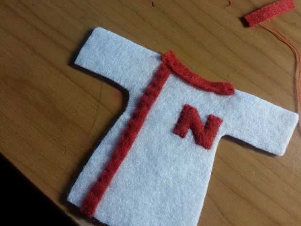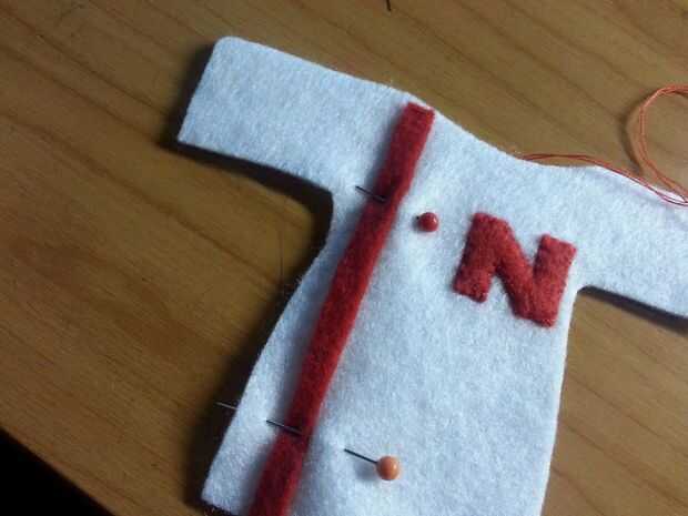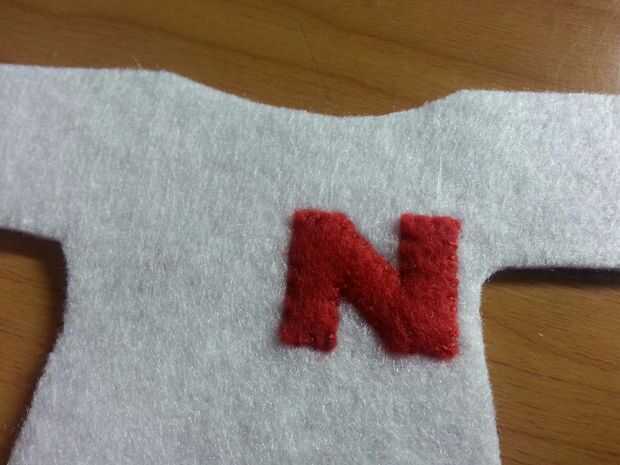 Comenzar con los dos pedazos de blanco más grande. Coser el N rojo, la franja roja y el collar en la parte delantera de la pieza de cuerpo