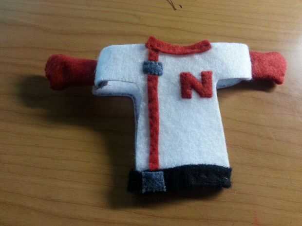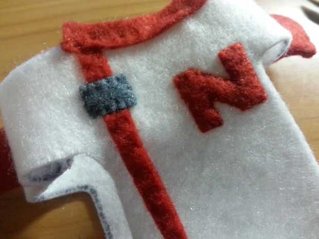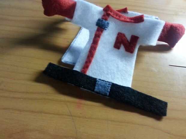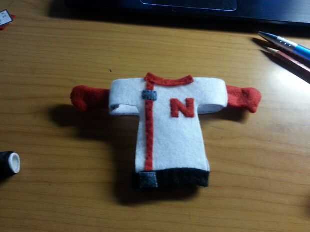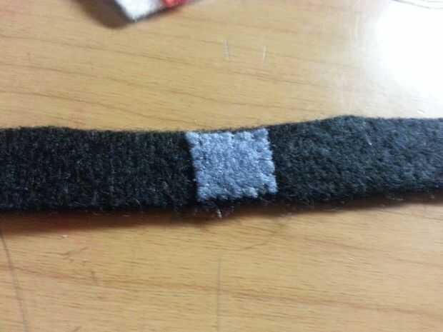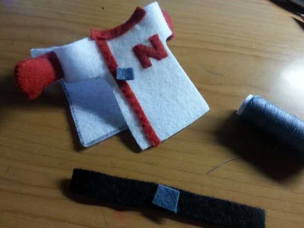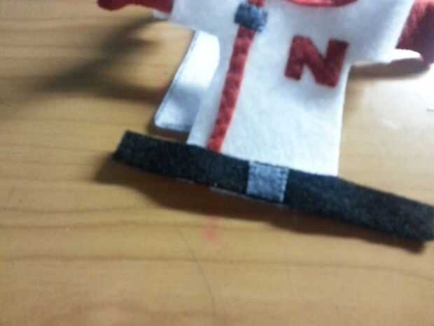 A continuación, coser las dos piezas gris en los lugares que se muestra en las fotos. Es el rectángulo más pequeño para la camisa y uno más grande se cose en la cinta