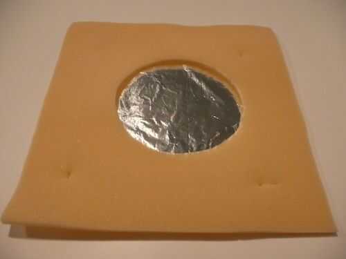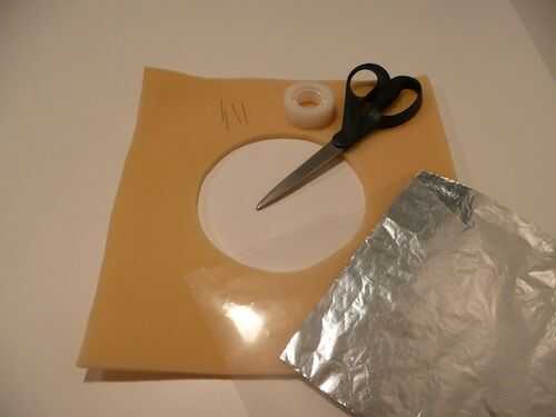 6. corte un agujero redondo (15 cm de diámetro) en la hoja de goma espuma suave. Este será el encargado de la distancia.