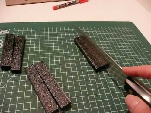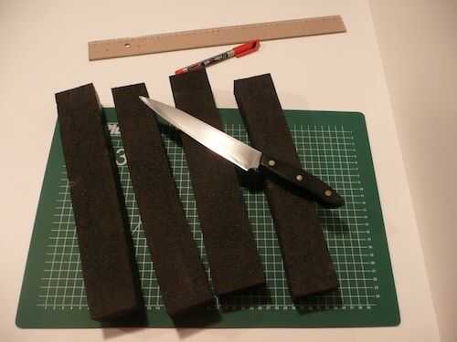 5. corta ocho piezas planas, rectangulares de goma. Estas se utilizarán para mantener las piernas en la posición correcta en la hoja inferior.