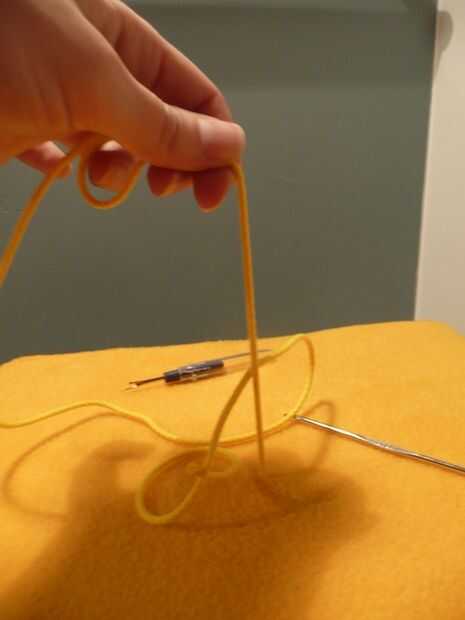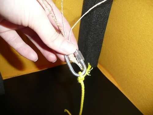 5. sentir en la parte superior del cubo para encontrar la cuerda amarilla, que todavía está atrapada en el interior. Hacer un corte pequeño y tirón de la cuerda hacia fuera. Puede usar el ganchillo.