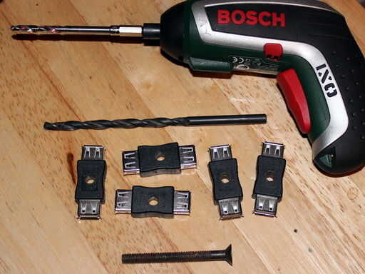 Esta unidad es aún más sencilla que el primero - sólo tenemos que perforar los adaptadores y conectarlos con un tornillo o perno. Aquí estoy usando un perno de 6mm porque es lo que tenía a mano. Usted realmente no necesita uno tan pesado como 6mm. Este tornillo es de 60mm de largo, que proporciona espacio para 5 adaptadores con suficiente izquierda montar la unidad. Las mechas más grande en la foto era necesario para facilitar los agujeros originales a 6mm.