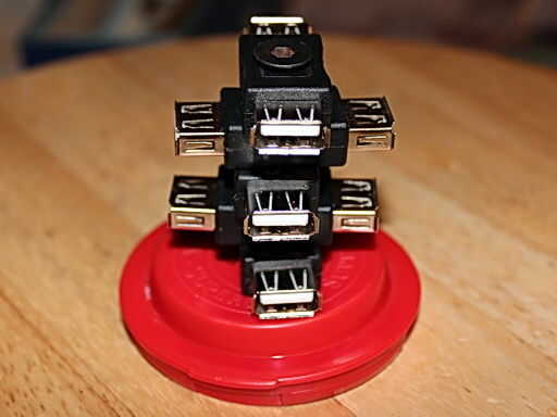 y aquí tenemos el artículo terminado. La base es solo una tapa de botella de píldora, con un par de arandelas debajo de la base de peso. Parece un poco flojo en retrospectiva, pero funciona bastante bien y estoy seguro que los lectores pueden subir con alternativas más bonito y más robustos. Los adaptadores incluso podrían atornillarse directamente en un ordenador de sobremesa si lo prefiere.