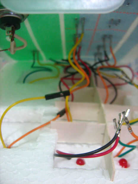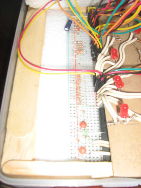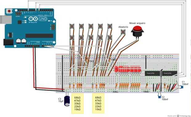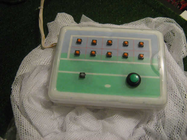 Vamos a utilizar el dispositivo de juego jugando el juego para decidir a donde y cuando para mover al portero. Para construirlo necesitamos LEDs, pulsadores, condensadores, resistencias y un 74HC595 Shift Register. Esta fue una de las partes más difíciles para hacer, pero después de unos intentos funciona muy bien.