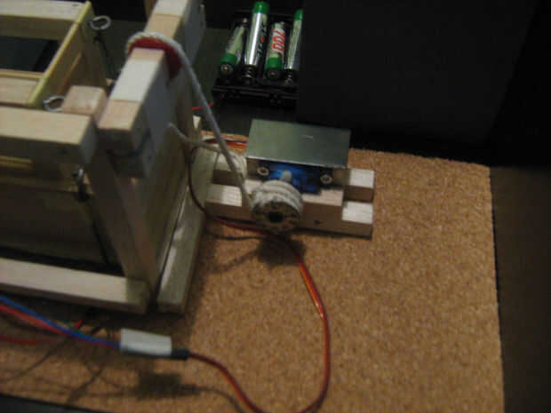 Para hacer el arquero salto utilizamos dos servos y una estructura de madera con poleas.