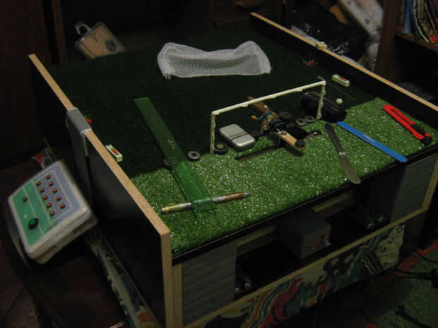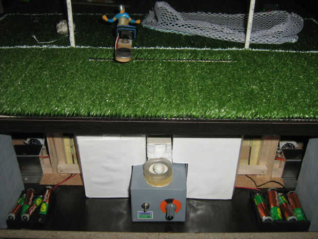 También utilizamos césped artificial; barra de cortina y red de la meta y un interruptor y un potenciómetro para el control de modos de juego: 1) mando o reponer 2) manualmente el arquero a la posición inicial.