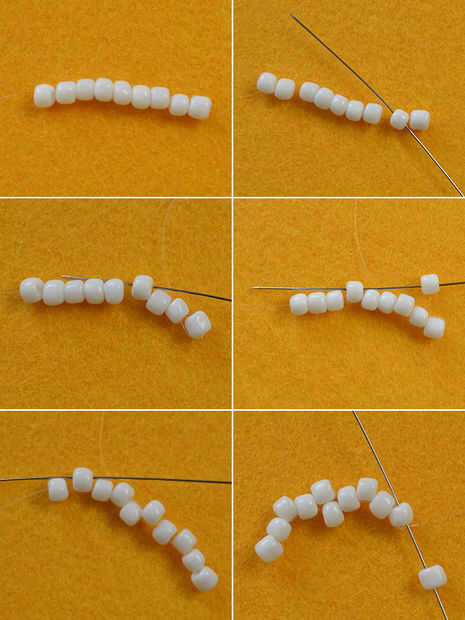 Cruz 4, el hilo de pesca a través de todos los granos de semilla blanca añadir un grano de semilla blanca de la aguja y pasarlo a través del último grano de semilla blanca.