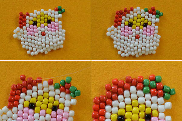 diapositiva 1, un grano de semilla roja de la aguja y el hilo a través del siguiente grano semilla roja, entonces añadir un grano de semilla roja y colócala en el grano de semilla blanca próxima;