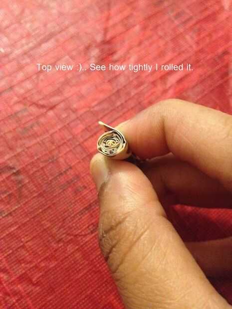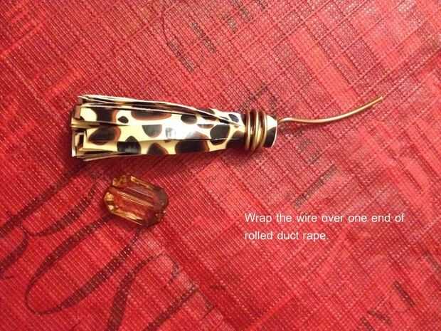 Tomar el alambre de cobre y rodó la cinta. Comience envolviendo la cinta firmemente con el alambre de cobre (envuelve tres veces, puede hacer 3 o 5 veces. pero hacerlo bien). Llevar alambre de cobre a la parte superior central de la cinta para agregar el grano.