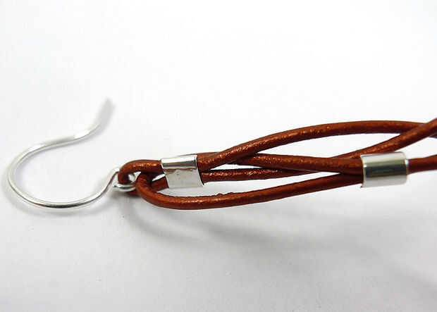 Ambos extremos de la segunda pieza de cuero a través de un grano de la encrespadura del hilo de rosca y subir la presión hacia la encrespadura aplanada. Usando sus alicates de cadena, aplane el prensado para que sea perpendicular al primer prensado que aplana. Repita este patrón para crear una serie de 8 plegadores aplanados, alternando los hilos de cuero doble. Recorte el exceso de cuero para que los hilos tienen la misma longitud.