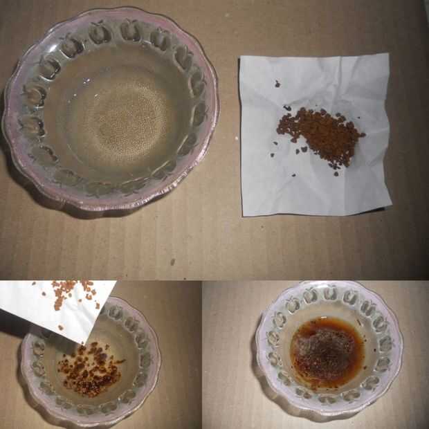 1-ahora para hacer el papel parece vieja, tomar una media cucharita de café en 1/8 taza de agua.