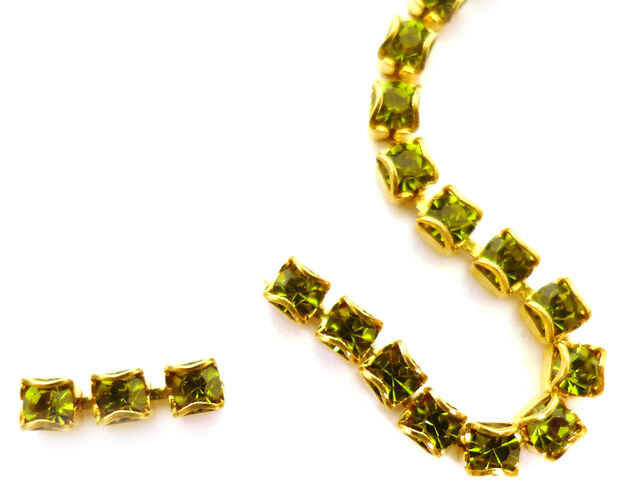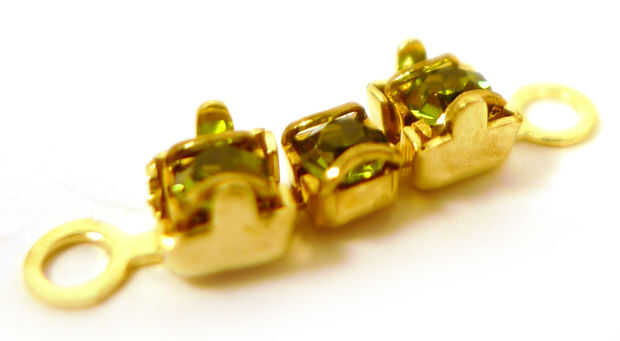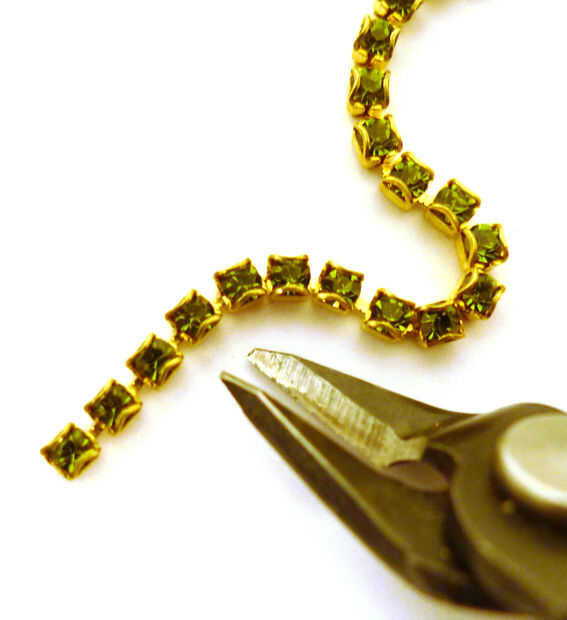 Ajuste cadena cristalina en dos secciones de enlace de 3. Introduzca el extremo de una sección en un extremo engarzado en cadena y aplanar las horquillas en la final de la cadena con sus alicates de cadena. Repita con el otro extremo para crear un eslabón de la cadena de cristal de 3. Repita con la segunda sección de la cadena.