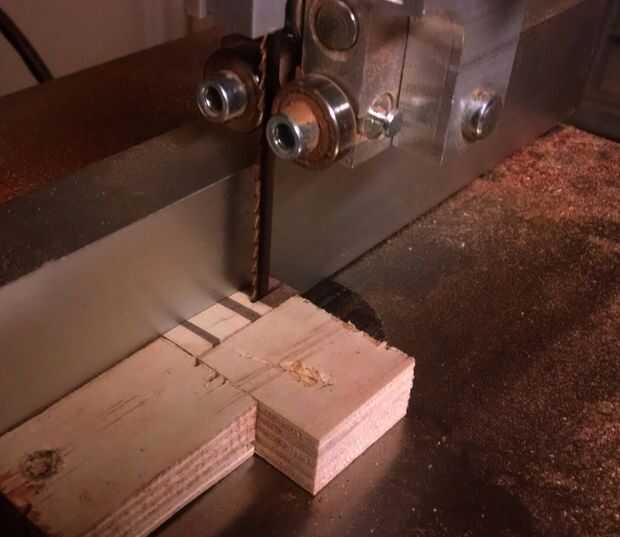 Es tiempo para cortar cada bloque en pendientes. Usando una sierra de banda, cortar los bloques por la mitad. Utilice varas para empujar,