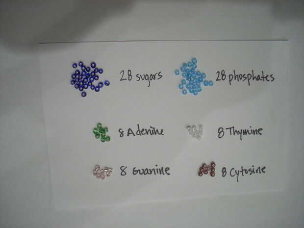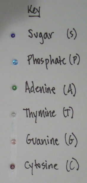 Hacer una llaveque muestra que el color del grano representa cada parte de un nucleótido (el azúcar, fosfato de, A, T, G y C.)
