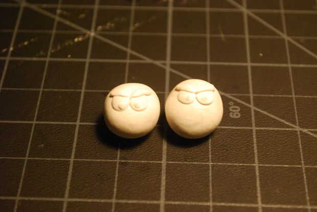 Rodillo de cuatro pequeñas bolas de igual tamaño de los globos oculares de birdie. Use una aguja o palillo de dientes para marcar donde poner los ojos y asegúrese de que está todo uniformemente. Rayar la superficie del cuerpo alrededor de la marca de palillo de dientes y raspar una pequeña zona en cada globo ocular. Juntar las áreas rayadas, aplanar los globos oculares en el cuerpo.