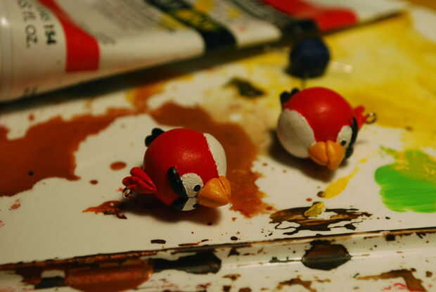 Pintar el cuerpo y cabeza de plumas rojo y deje seco. Pintar todos los blancos, los ojos y el vientre, luego los ojos negros, cejas y plumas de la cola. Mezclar otras amarillas con un poco de rojo para hacer perfecta pico naranja y pintar el pico.