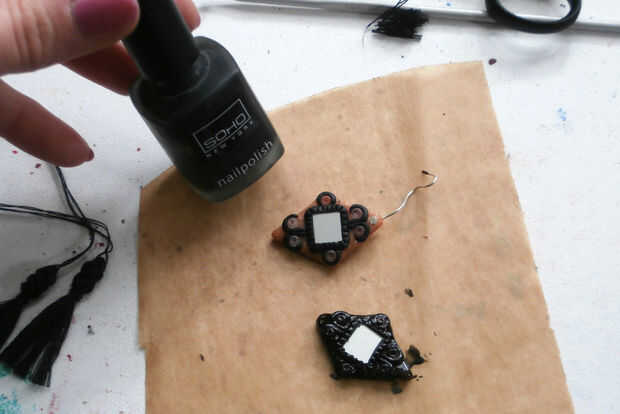 Aplique cuidadosamente una capa de esmalte. Los diamantes reciben un abrigo negro, usar un abrigo sellado para los rojos. Esto evitará que los granos en su lugar.