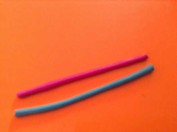 primero deberás conseguir dos colores de arcilla y rodarlos en serpientes delgadas.