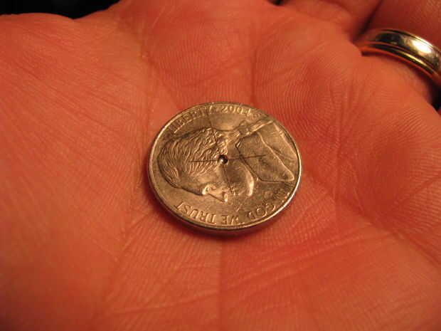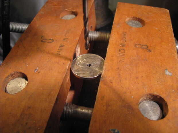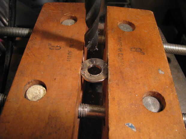 El anillo de la abrazadera. Comenzando con una broca pequeña, perforar el centro mayor. Progresivamente, perfore un agujero más grande hasta que ajusta en el mandril de su uso. Usé una barra de palanca como el mandril.