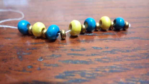 Pasar la aguja a través de las cuentas a partir de una pequeña cantidad entonces un grano grande y la secuencia continúa hasta tiene 7 grandes y 7 pequeños gránulos