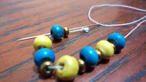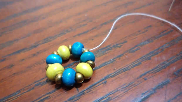 Formar un círculo completo pasando la aguja por el grano primero más cerca al nudo (este es su punto de partida) pasar la aguja a través de todos los granos (3 a la vez) hasta llegar a su punto de partida otra vez. Si usted siente que su círculo de perlas no se mantiene lo suficientemente apretada como pasar la aguja a través de todos los granos otra vez pasando la aguja a través de 3 cuentas cada vez, hasta llegar al final.
